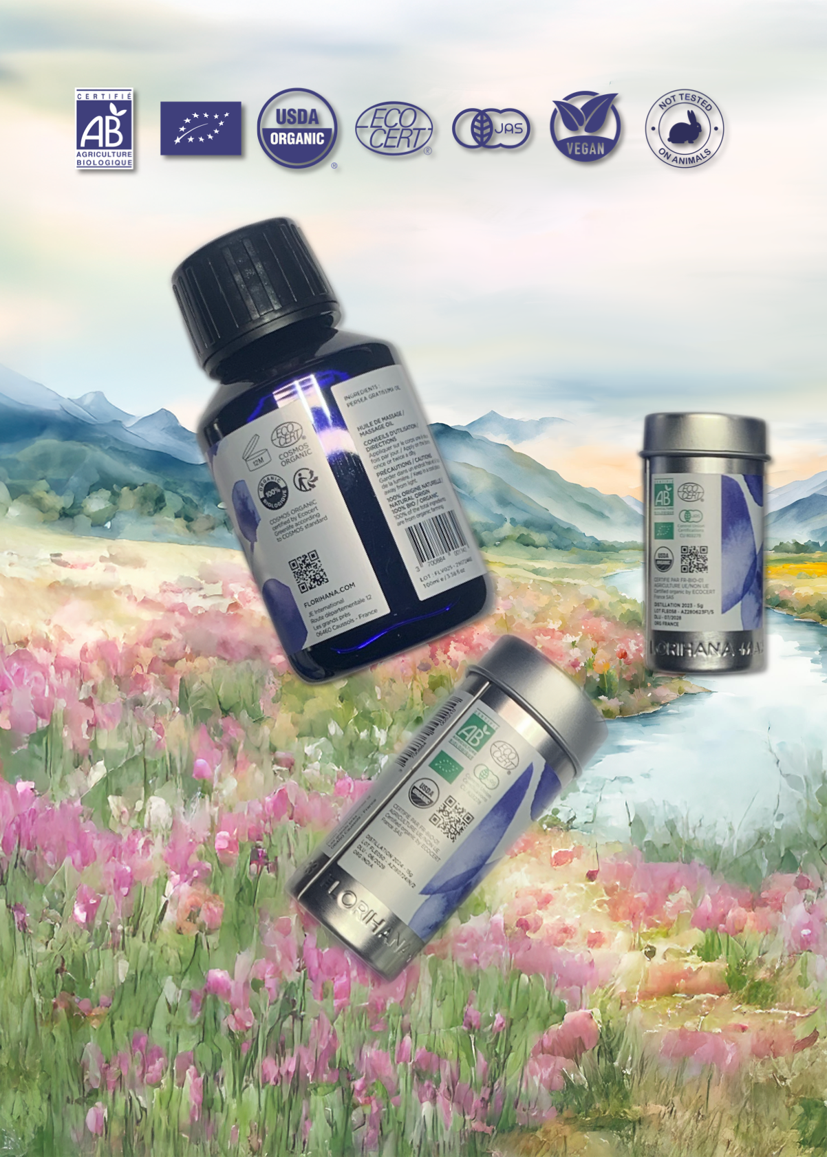 Every essential oil, hydrosol, and botanical ingredient we offer is certified organic and 100% natural — produced by Florihana, our partner distillery in Provence.